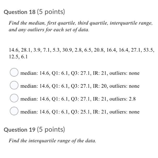 Median: 14.6, Q1: 6.1, Q3: 27.1, IR: 21, outliers: none