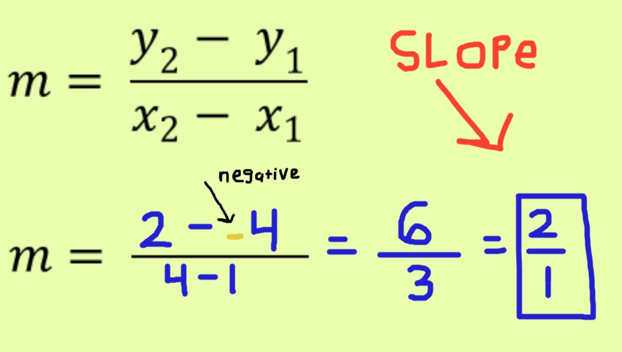 slope, m = (y2-y1)/(x2-x1) = (2-(-4))/(4-1) = 6/3 = 2