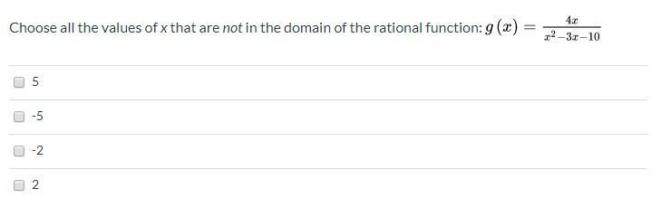 The values of x that are <em>not</em> in the domain of the rational function are x = -2 and x = 5.