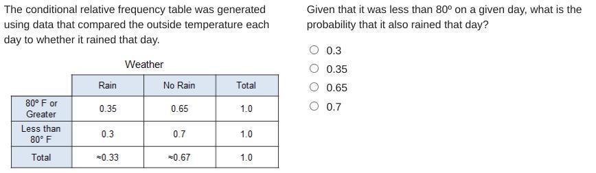 Looking at the row for "Less than 80° F", the column for "Rain" shows a 0.3 probability in the table. Therefore: