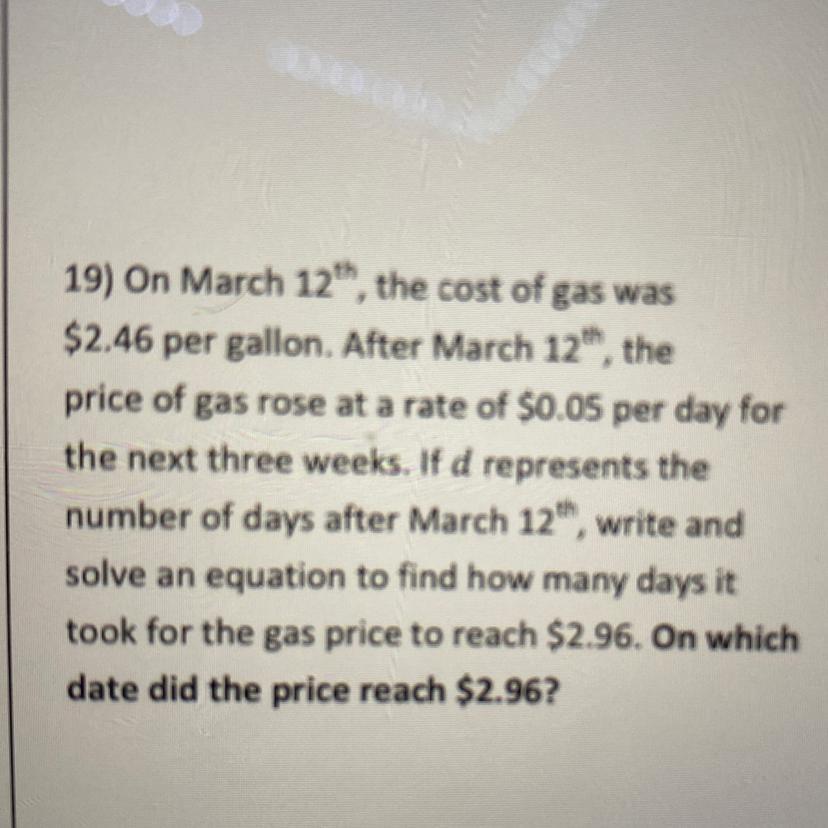 Using this equation you can solve for d by moving the +2.46 to the other side of the = sign and this becomes 00.5d=2.96-2.46, from there we can move the 0.05 over to isolate the d. The equation should look like d=0.50/0.05, this than calculates to 10 days and the price of $2.96 was reached on the 22nd of March.