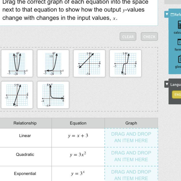 Drag the correct graph of each equation into the space next to that equation to show how the output y-values change with changes