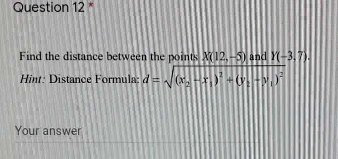 The distance fro, (12,-5) to (-3,7) is