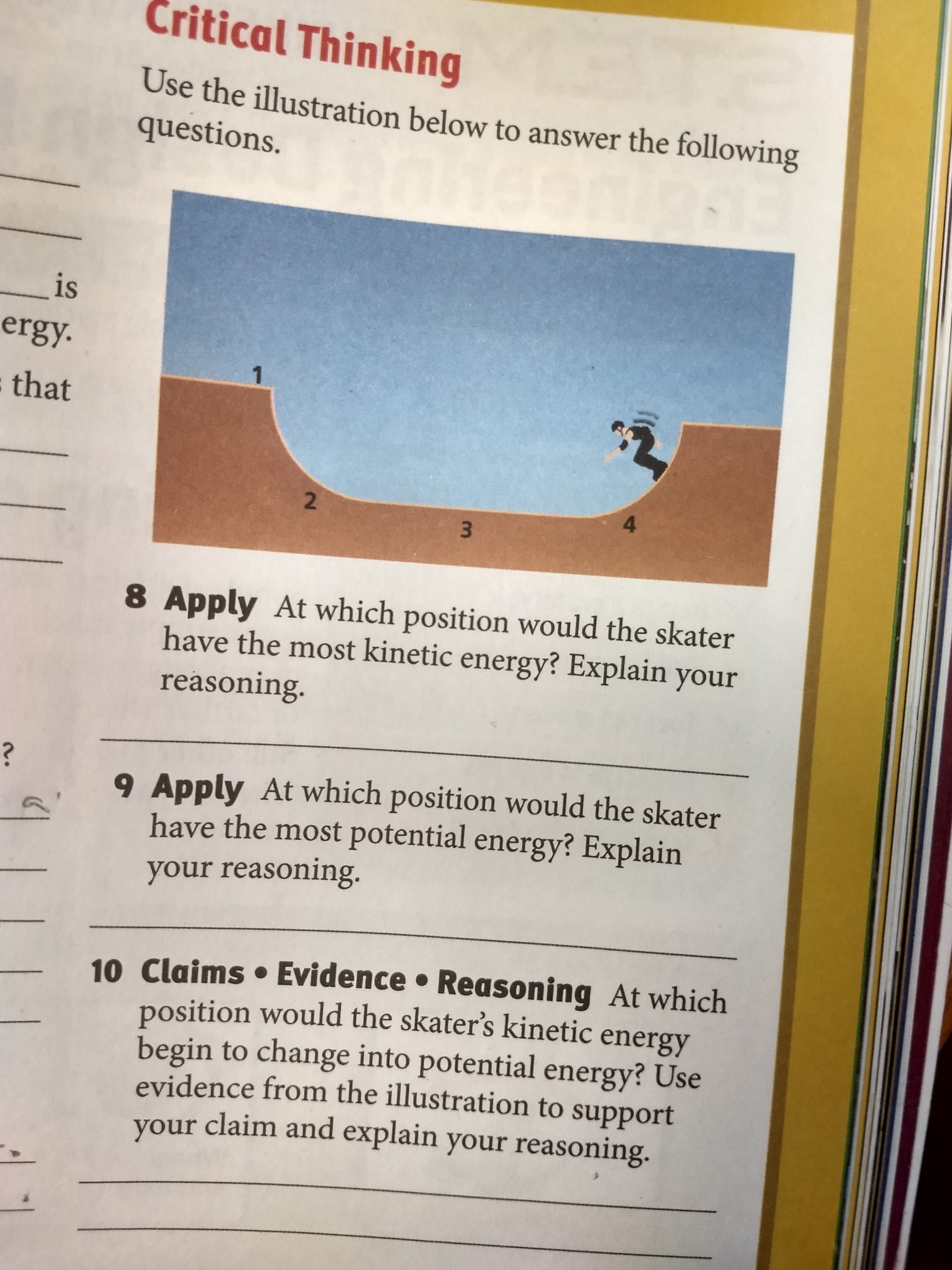 At four he is the highest, with the most potential energy, when he reaches 3 he will have the most kinetic energy as he is in the process of turning all the potential energy to kinetic, as he reaches 3 and 2 he loses all the kinetic energy, when he is at one, and not in motion ha has only potential nergy that is un-used.