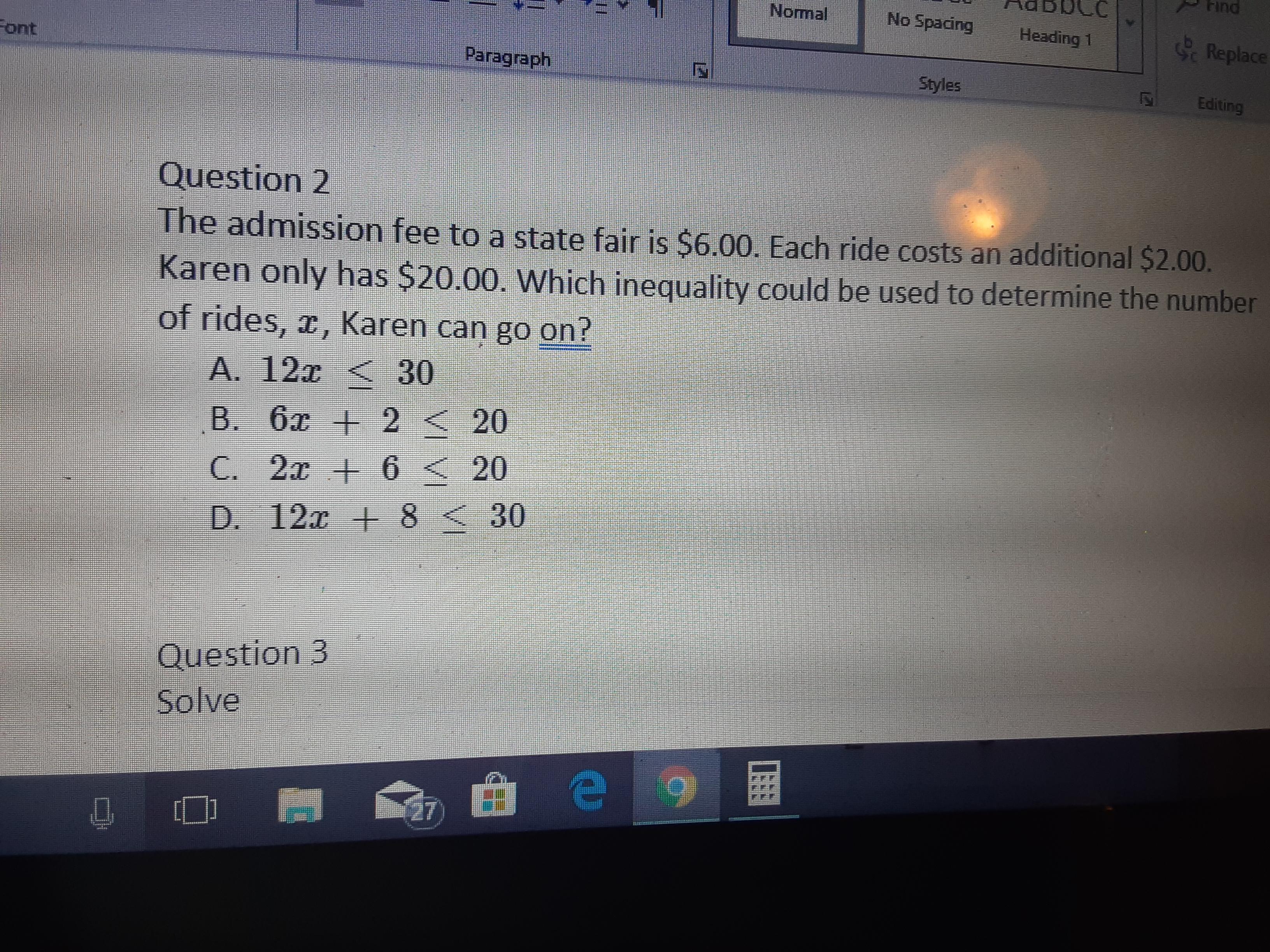 Each ride costs $2, meaning that we can represent this amount with 2x, which is just $2 times the amount of rides she will go on. When fully written out, the inequality is 2x + 6 (less than or equal to sign) 20, making C the correct answer.