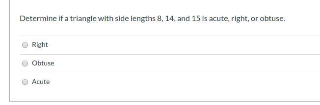 The side lengths 8, 14, and 15 are given. We can assume the hypotenuse (or c) is the longest side length, so it is 15.