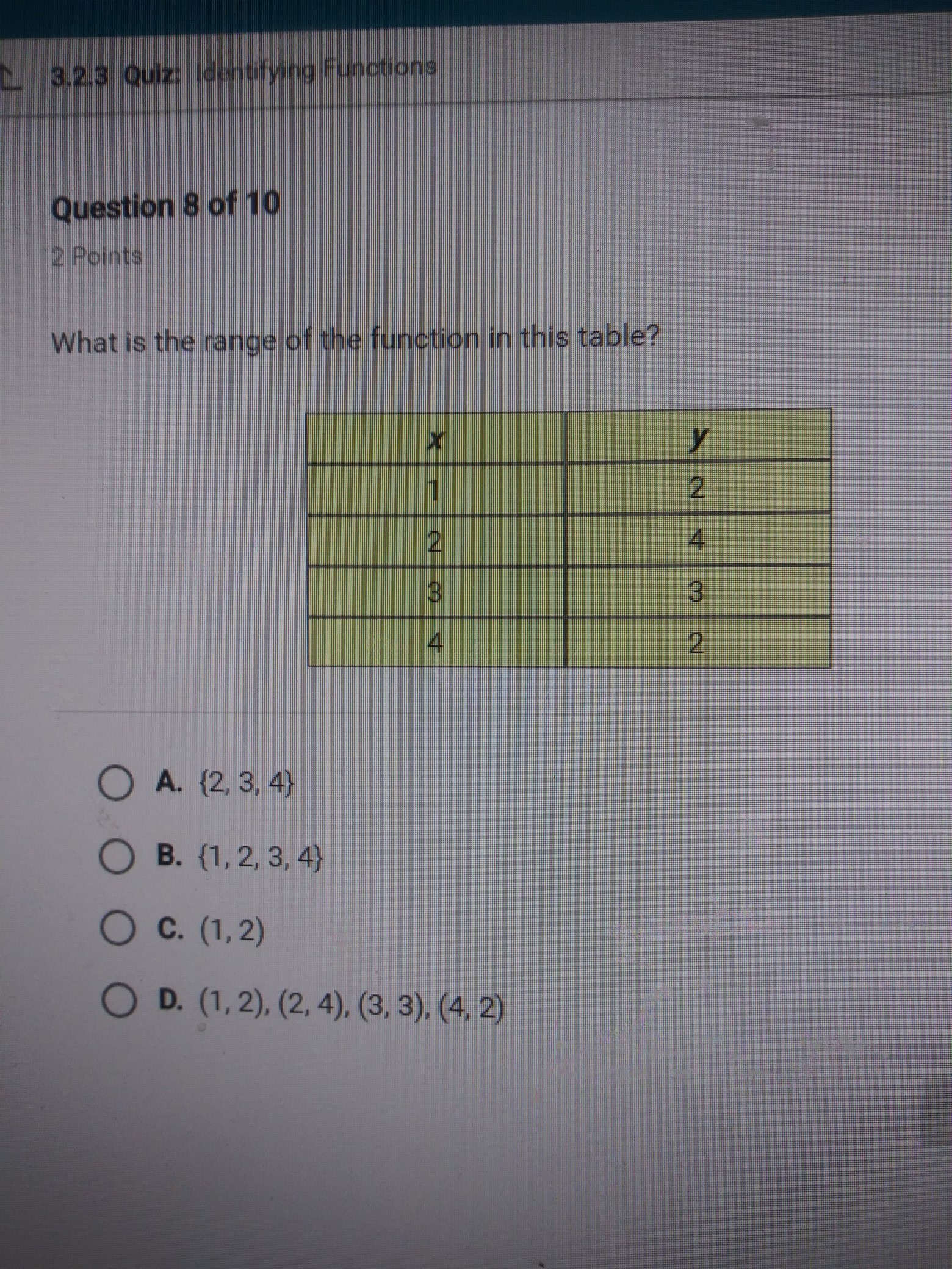 Thus, the final set for the range of the function is {2, 3, 4}, or Choice A.