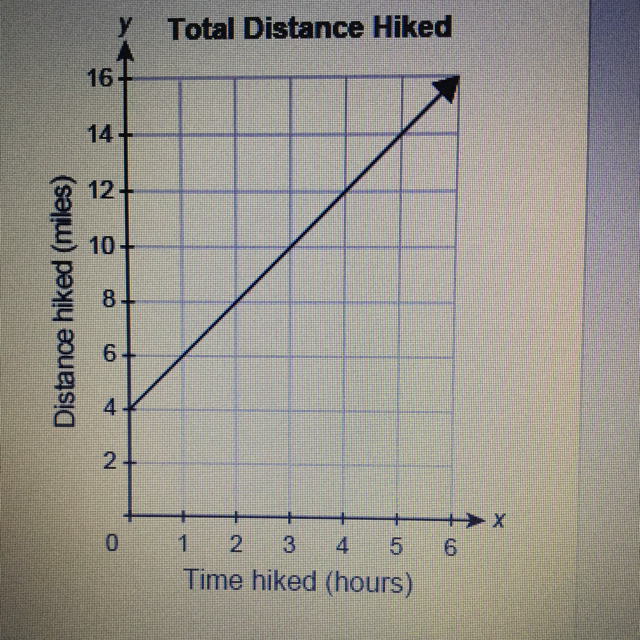 The slope is 2; The slope represents the number of miles hiked every hour; The y-intercept is 4; The y-intercept represents the total distance hiked at the start of the second day.