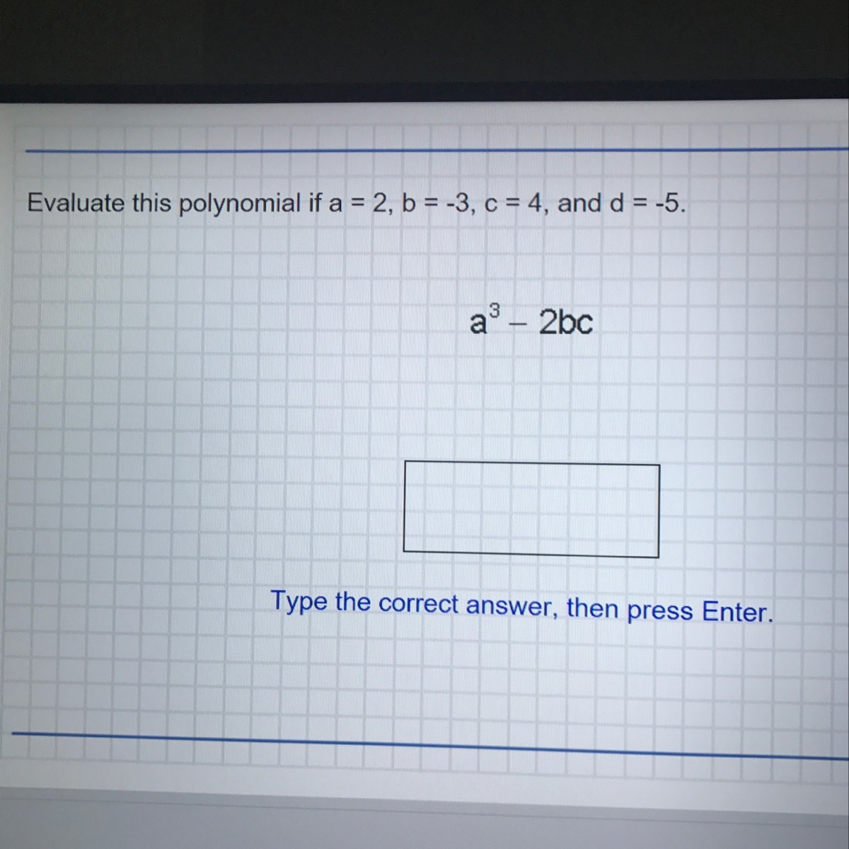 a³ - 2bc =(2³) - 2(-3) - 4==> 8 + 6 +4 ==> = 18