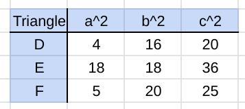 To compute the square of the length of a sloped side, you need to sum the squares of the rise and the run. For example, the square of the length of 'a' in triangle F is ...