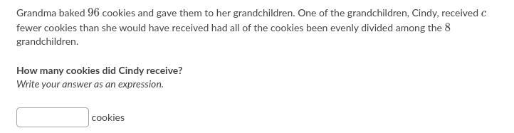 where 96/8 means The number of questions each child would have gotten if the grandma was fair, and - c means the amount of cookies fewer Cindy received.  Simplifying this, makes the expression 12 - c.