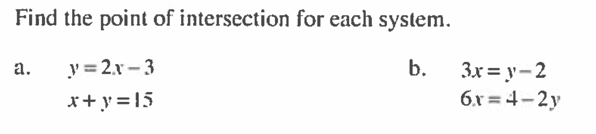 The point of intersection between the two systems in a, is (6,9). the point of intersection between the two systems in b, is (0,2). to find them all you have to do is just solve for the first variable and then substitute that answer into the other equation.
