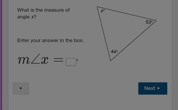 The total degrees in a triangle are 180 (degrees), so add up all the angles and make them equal to 180; 44 + 53 + x = 180, 97 + x = 180, m<x = 83 degrees!