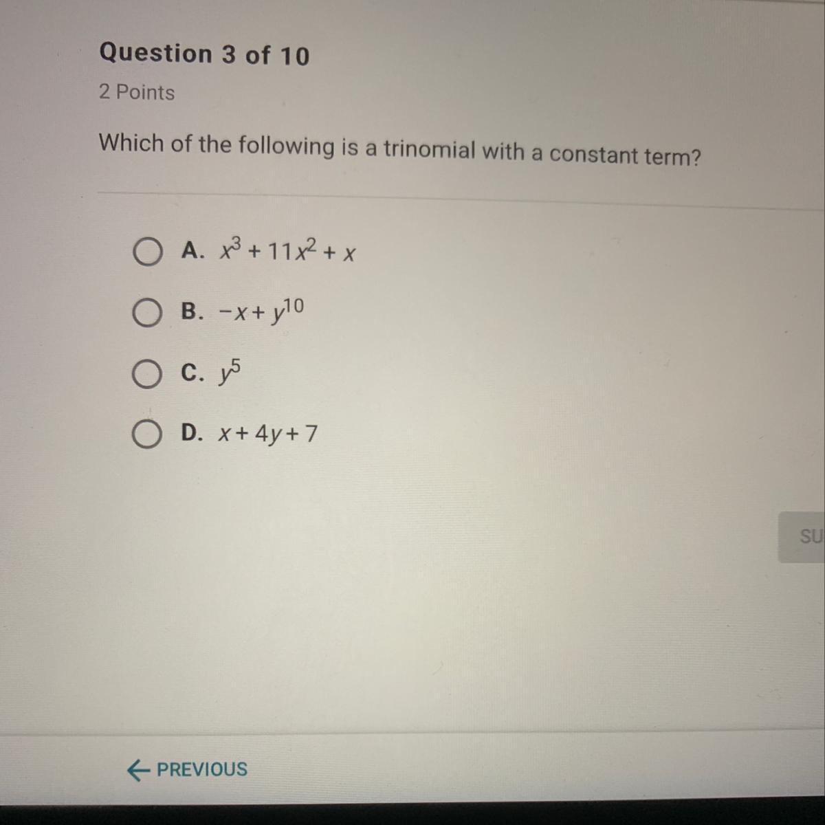 In this case, D is your answer, for the term 7 is a constant, with no variables next to it.