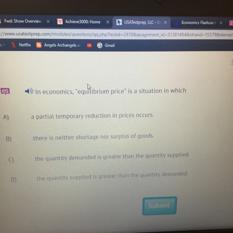 The correct answer is B: "There is neither shortage nor surplus of goods".