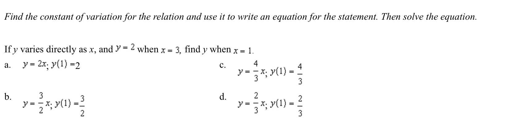 Given that if y varies directly as x, and y=2 when x=3, then we need to find out y-value when x=1.