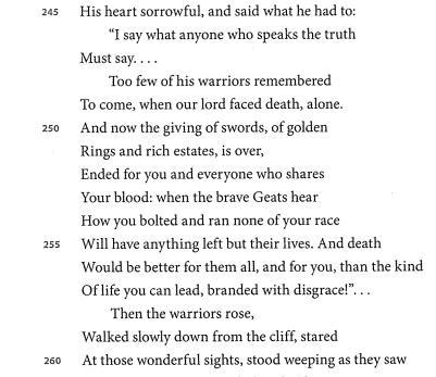 In these lines, we see that Wiglaf is speaking to his fellow warriors after Beowulf died heroically fighting a dragon. Wiglaf is cursing the other warriors because of their cowardice - when the dragon attacked, Beowulf, as king, volunteered to defeat the monster even though he was very old. He was helped only by one of his men - Wiglaf, who helped him in the battle. None of the other warriors dared to risk their lives against the terrible monster.