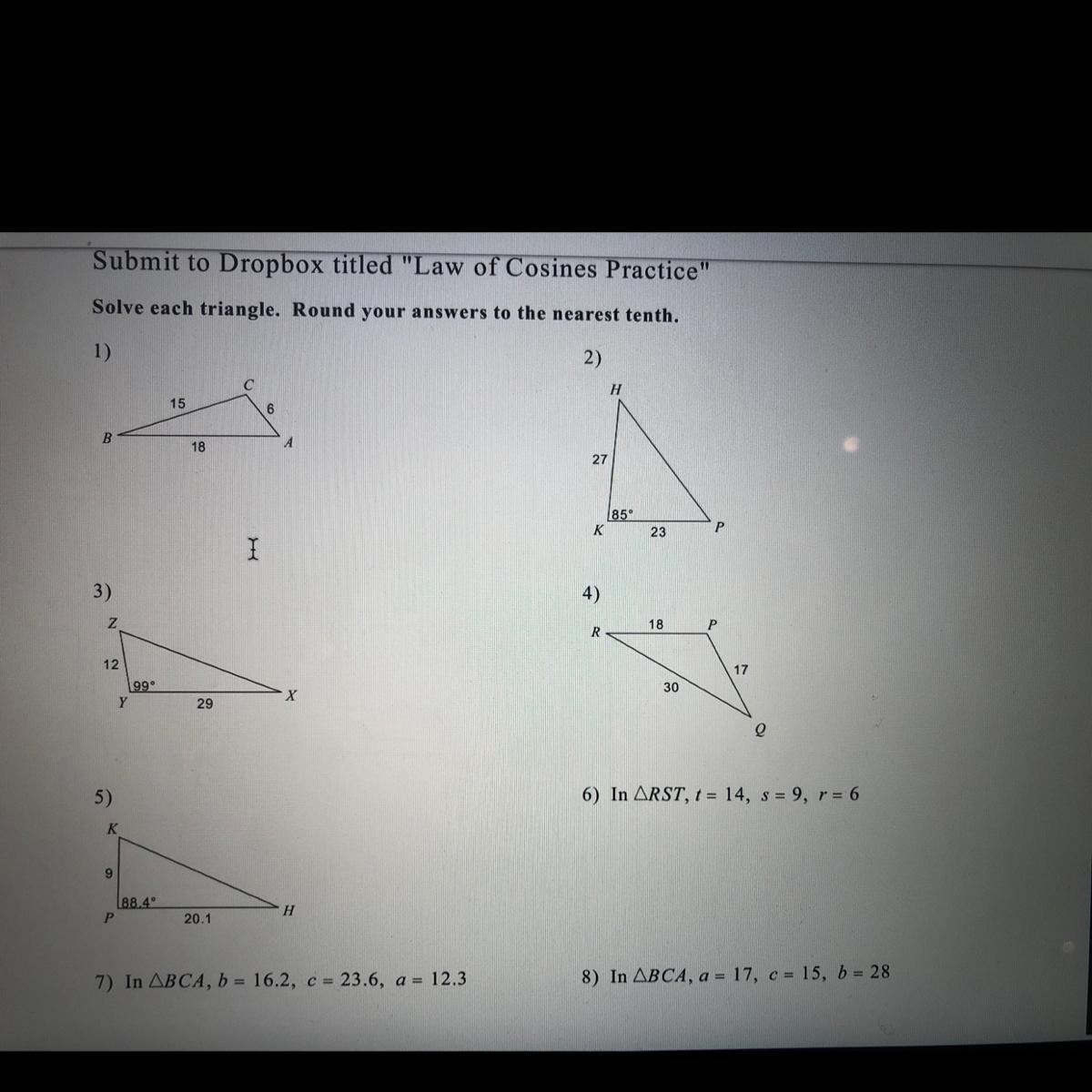 7) cos C = (23.6² - 16.2² - 12.3²)/-2(16.2)(12.3)