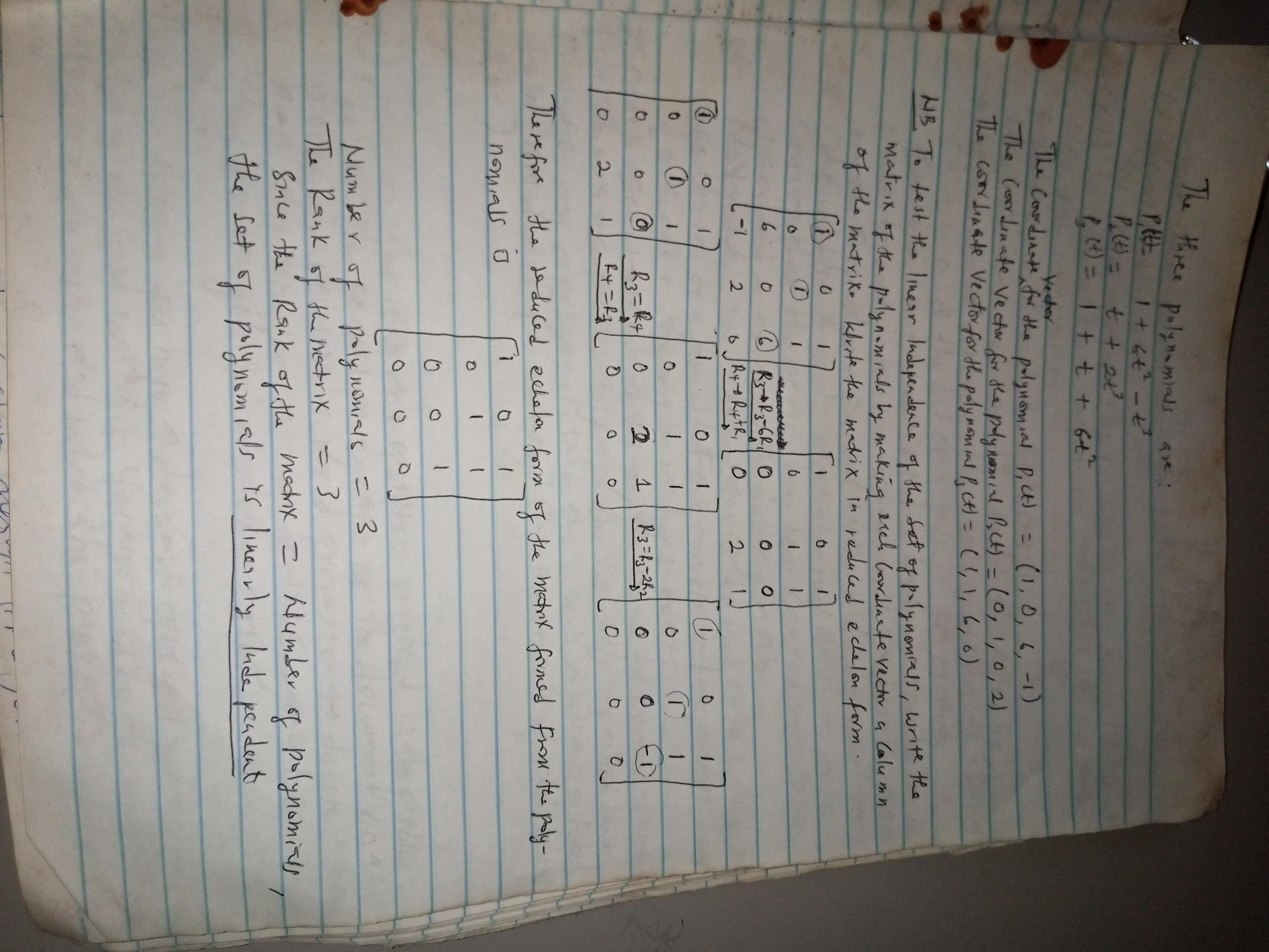 5) since the rank = number of polynomials = 3, the set of polynomials is linearly independent.