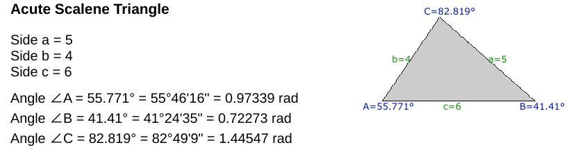 C = arccos((4² +5² -6²)/(2(4)(5))) = arccos(5/40) ≈ 82.8192°