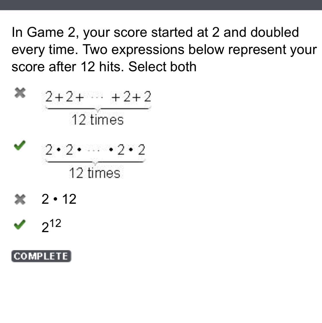 2^2 is the same thing as 2*2. Both of them equal 4. So the question gave you the answer of 2*2*2*2.... twelve times, and 2^12 which are the same thing, just one is written out more.