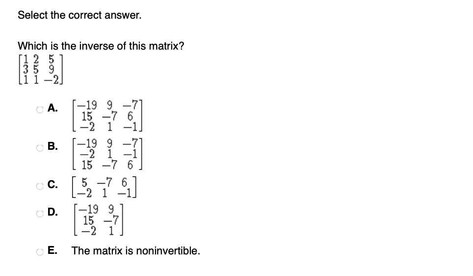 ![\text{\bf{A.}}\qquad\left[\begin{array}{ccc}-19&9&-7\\15&-7&6\\-2&1&-1\end{array}\right]](https://tex.z-dn.net/?f=%5Ctext%7B%5Cbf%7BA.%7D%7D%5Cqquad%5Cleft%5B%5Cbegin%7Barray%7D%7Bccc%7D-19%269%26-7%5C%5C15%26-7%266%5C%5C-2%261%26-1%5Cend%7Barray%7D%5Cright%5D)