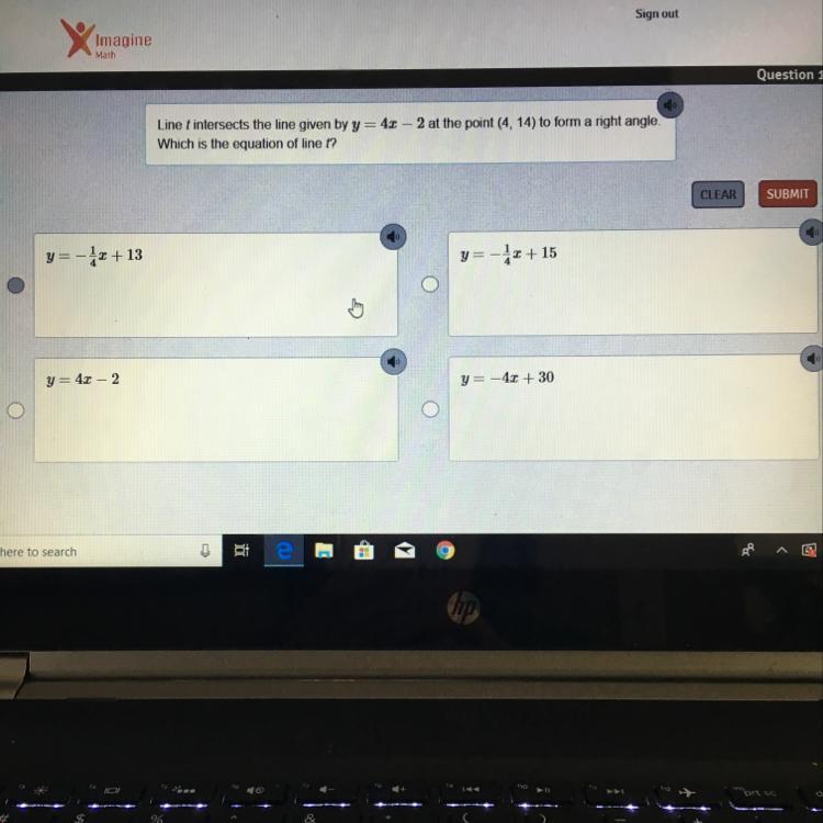 Line t intersects the line given by y=4x-2 at the point (4,14) to form a right angle. Which is the equation of line t