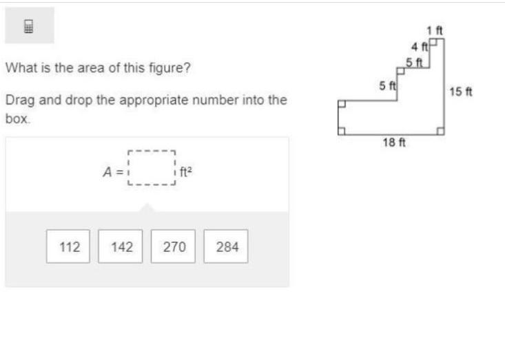 ASAP PLZ I NEED HELP What is the area of this figure? Drag and drop the appropriate number into the box. A = ft² A shape made up