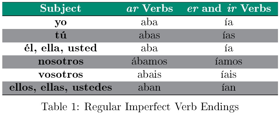 regular imperfect, one for ar verbs and one for both er and ir verbs. If you want to conjugate a regular verb in the imperfect tense in Spanish, you need to remove the infinitive ending (ar, er, or ir) and add the imperfect ending that matches the subject, as indicated in Table 1 (below).
