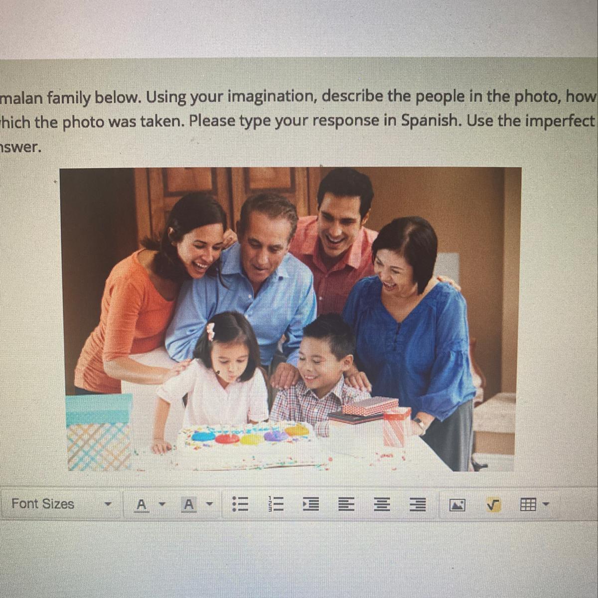 La familia en la foto está celebrando el cumpleaños de La Niña pequeña, se ven muy felices todos. Esta familia está conformada por su padres, abuelos y su hermano.