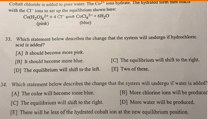 [Co(H2O)6]^2+ + 4Cl^- ------> [CoCl4]^2- + 6H2O, the equilibrium position will shift to the left. When the equilibrium position shifts to the left, more chloride ions are produced. and the hexaaquacobalt II complex is formed and the solution turns pink as shown hence the answer given.