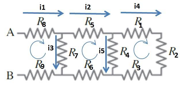De aquí en adelante tendremos presente que las todas las resistencias son iguales entre sí y por ende igual a 125 Ω. Las notaciones del 1 al 9 son para poder mostrar la resolución del problema.