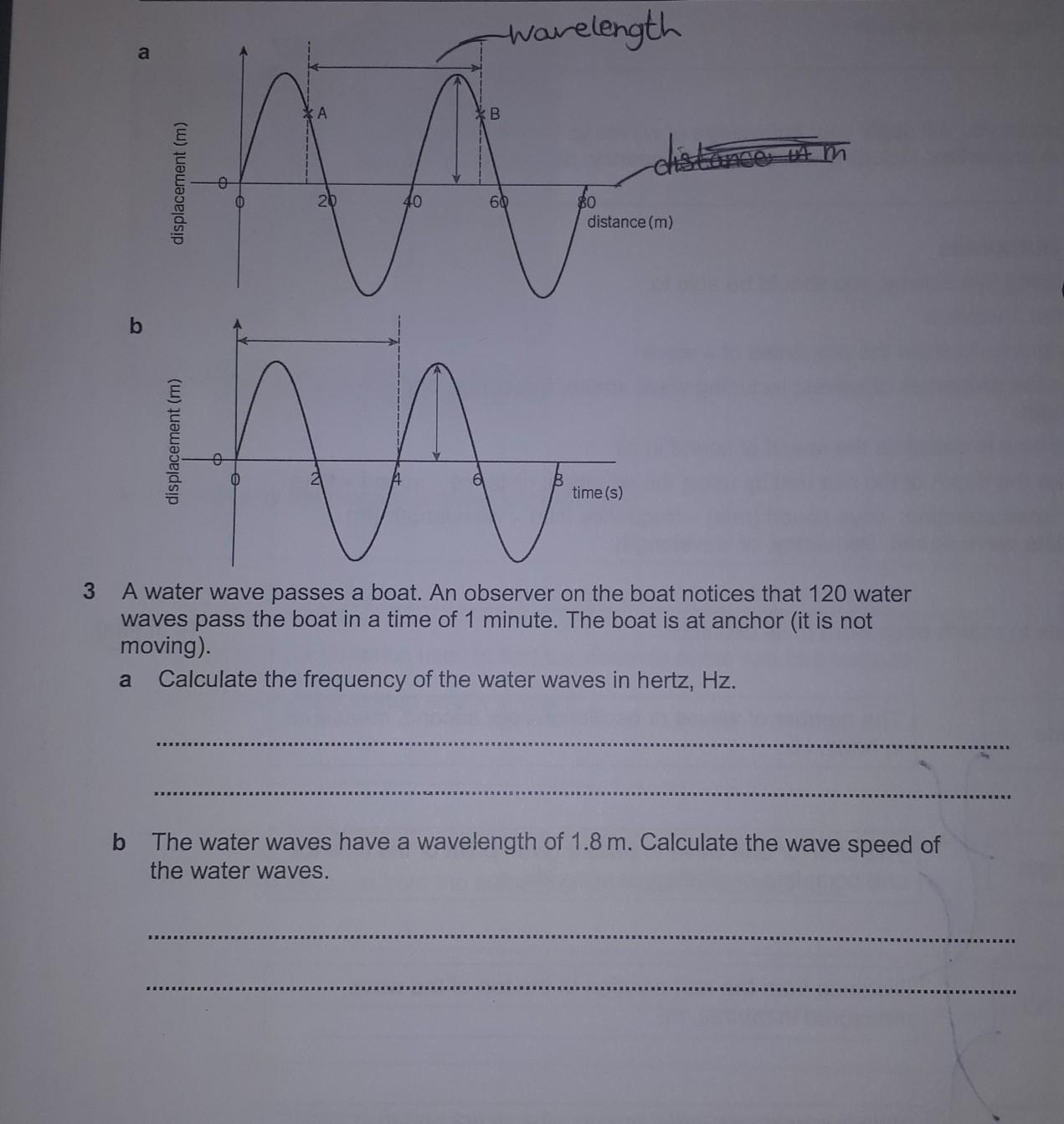 (b) Then if the wavelength of the water wave is 1.8 m with a frequency of 2 Hz, then speed of the wave can be determined as the product of wavelength with frequency.