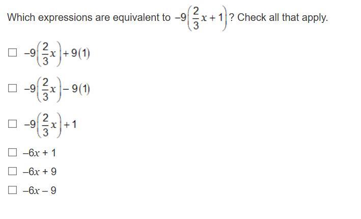 -9(\frac{2}{3} x+1)\\-9(\frac{2}{3} x) + -9(1)\\-\frac{9}{1} *\frac{2}{3}x -9\\-\frac{18}{3}x -9\\ -6x-9\\