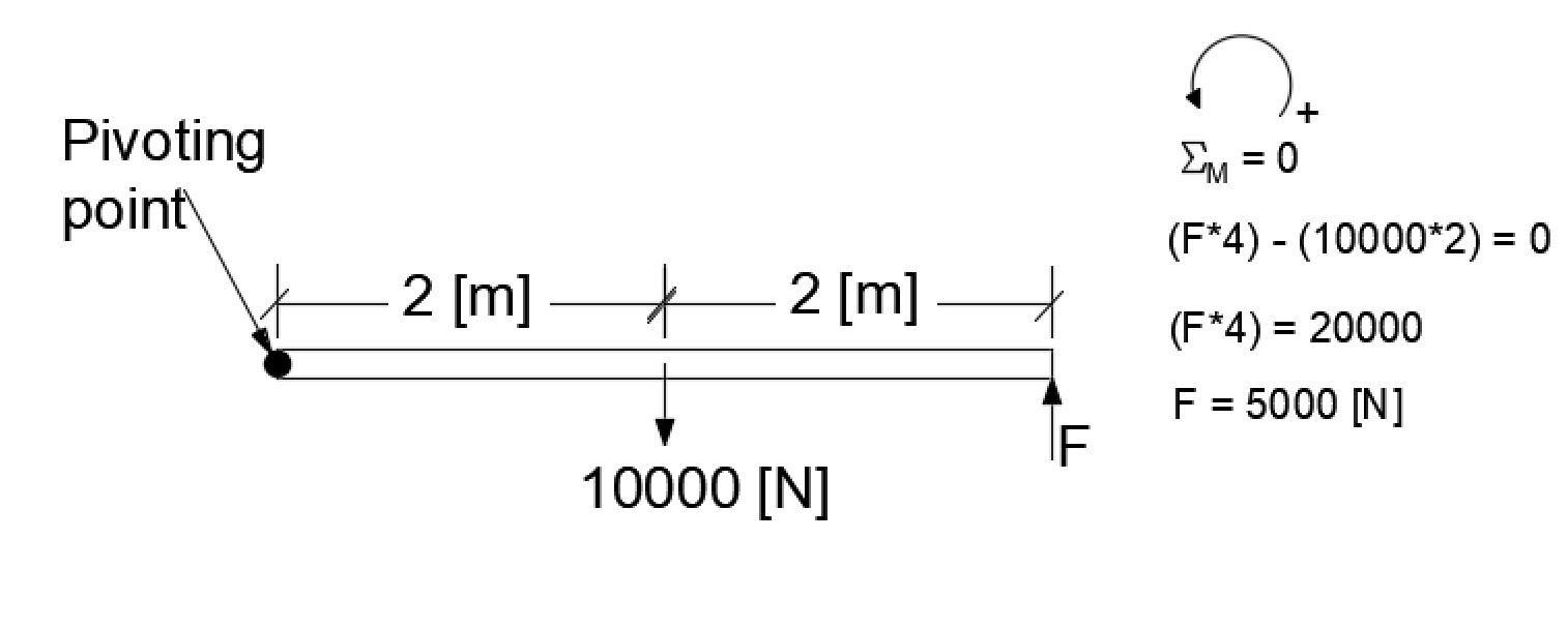 In the attached image we can see a beam which is subjected to loads, and performing a summation of moments around the pivoting point equal to zero (the beam is in balance) we can find the value of force F.