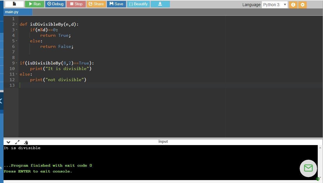 if(isDivisibleBy(8,2)==True):