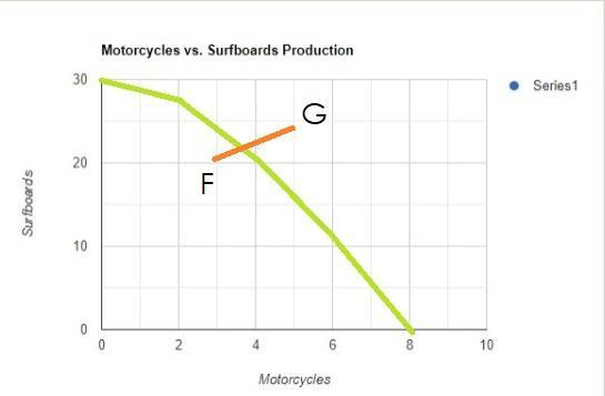 Points F and G imply that if you manufacture 3 motorcycles you can only manufacture 21 surfboards (F), and if you manufacture 5 motorcycles the production of surfboards increases by 3 (24 surfboards).