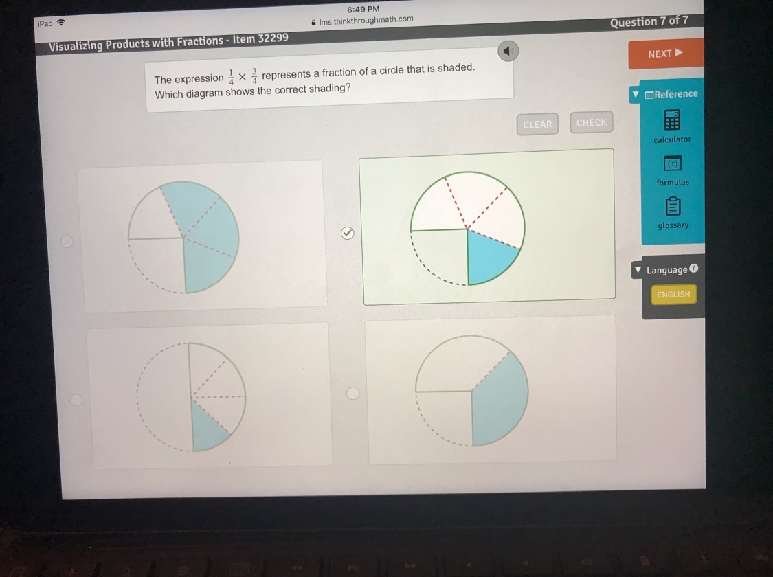 You should try to see what the actual answer is. It might be confusing so I hesitate to include it. 1/4 * 3/4 = 3/16. Is there any way to tell that what is in the dark blue region is 3/16 of the circle? I don't think so, not directly.