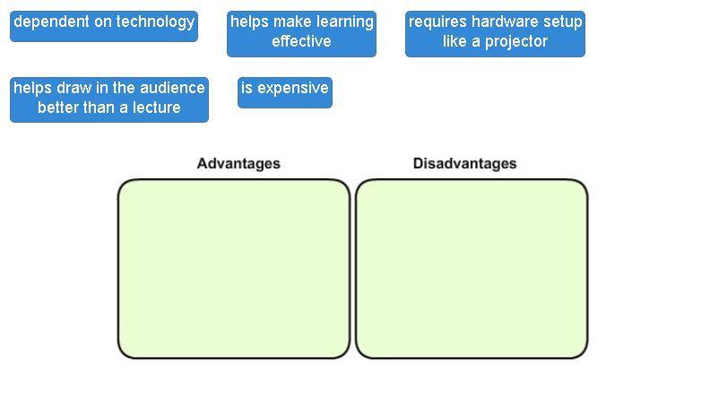 Answer: Disadvantages are requires hardware setup like a projector, is expensive, and dependent on technology. Advantages are: helps draw in the audience better than a lecture and helps make learning effective.