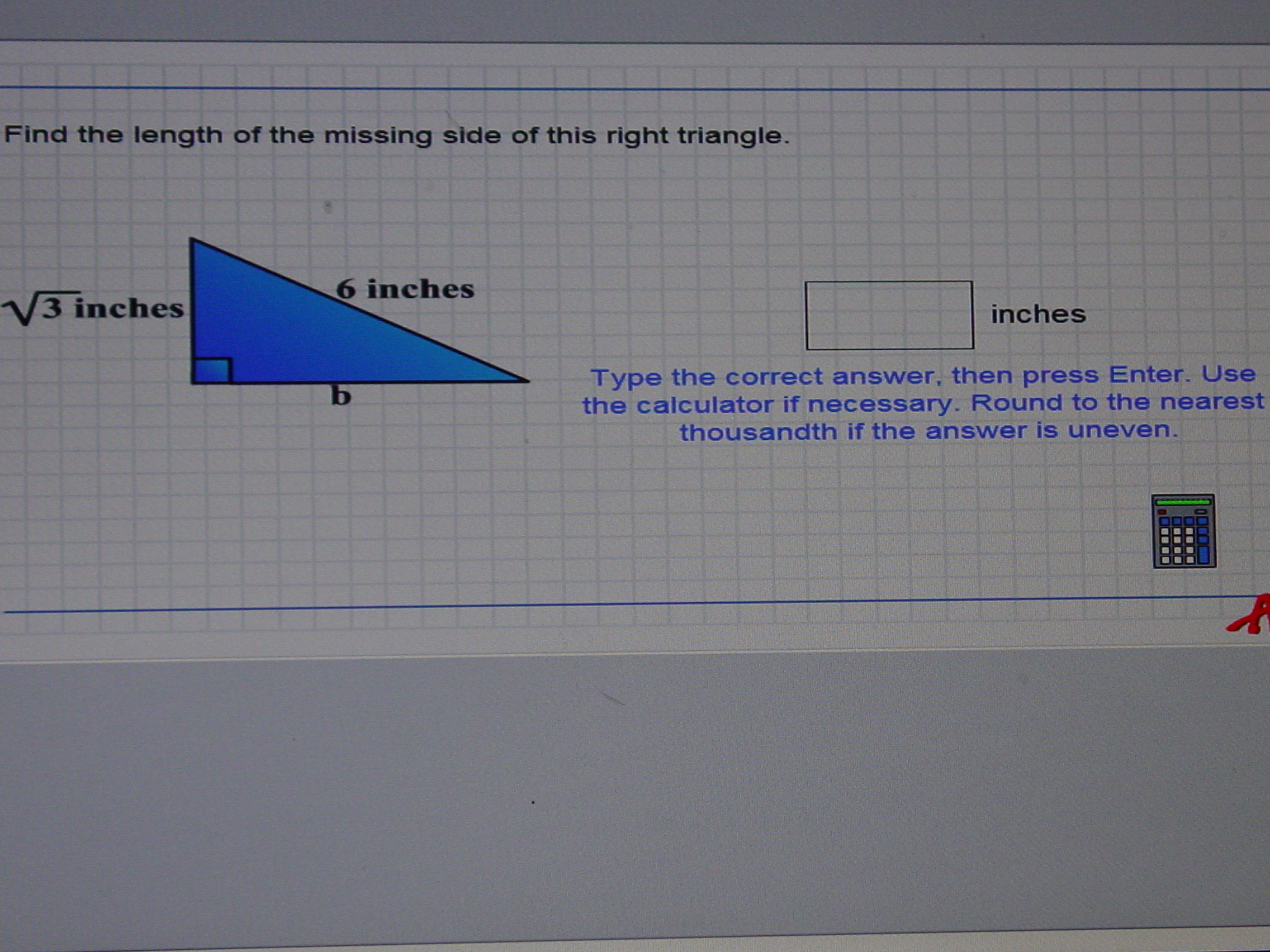 To this question, we have to apply the Pythagorean Theory. a-square+b-square+c-square. We know that the side which says, the square root of 3, it would just be 3. The Hypotenuse is 6. So we apply the formula reverse. 3+n= 36, because 6 squared. 36-3= 33. The square root of 33 is 5.74456264654