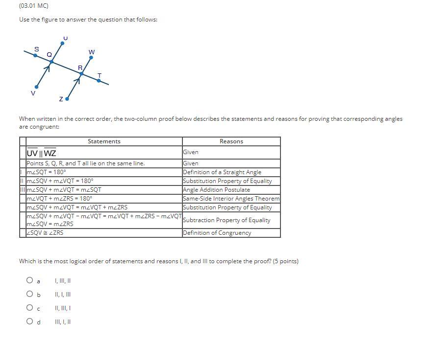 Now, lets take a look at II. It states that m∠SQV + m∠VQT = 180 by the Substitution Property of Equality. We can find that m∠SQV + m∠VQT = 180 just by looking at the image along. But knowing that it is found by the Substitution Property of Equality, we can find that m∠SQV + m∠VQT = 180 was derived from the fact that m∠SQT = 180 and that m∠SQV + m∠VQT = m∠SQT, or I and III. So II was derived from I and III, and II should come after I and III.