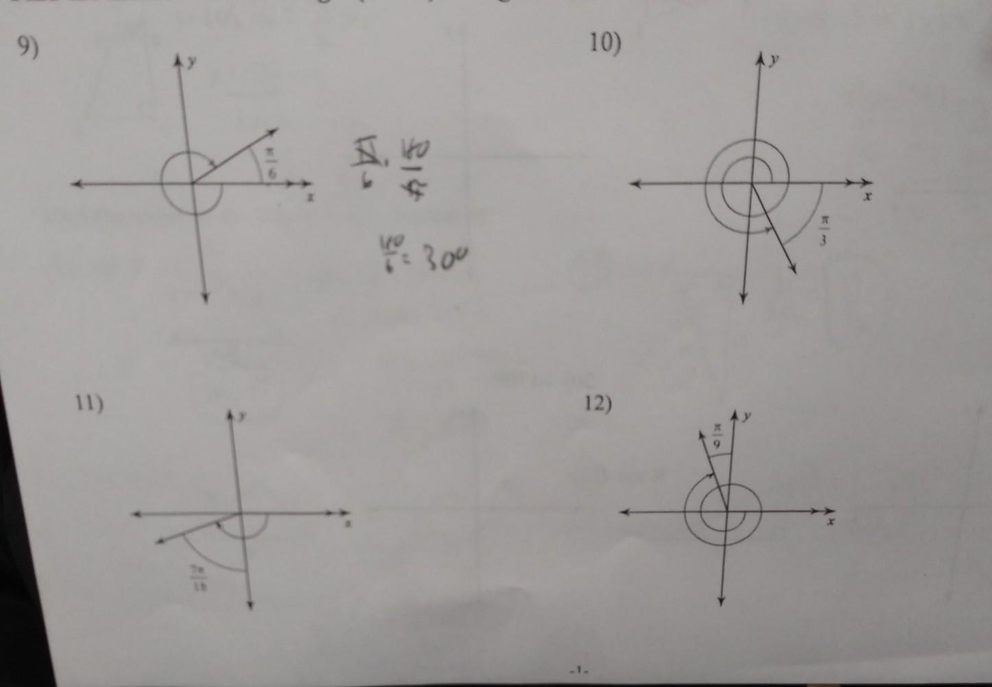 This is not correct. It would be correct if the longer arc mark was not there. However, because it is there, you have to travel 360-30 = 330 degrees in the negative direction. So the angle shown along that arc is -330 degrees which converts to -11pi/6 radians.