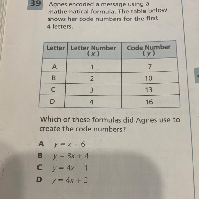 Agnes encoded a message using a mathematical formula. The table below shows her code numbers for the first four letters. Which o f these formulas did Agnes use to create the code numbers? Will mark BRAINLIEST if correct! 20 points!