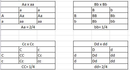 Thus, the probability or proportion of the offspring to have genotype AabbCCdd = 2/4 x 1/4 x 1/4 x 2/4 = 4/256 = 1/64