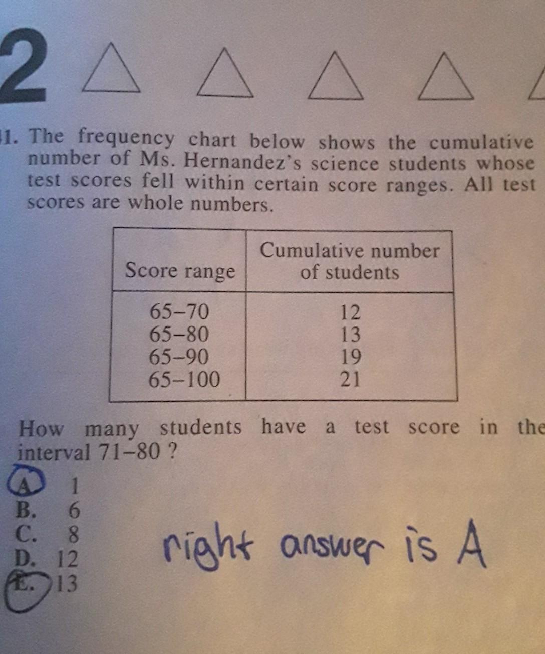 Now, to find the number of students who score in the interval 71-80, we will look in the frequency chart. In the chart score range of 65-80 the cumulative number of students are 13. As the 71 to 80 comes in between the score range 65-80 and there are 13 students who scored in this range.