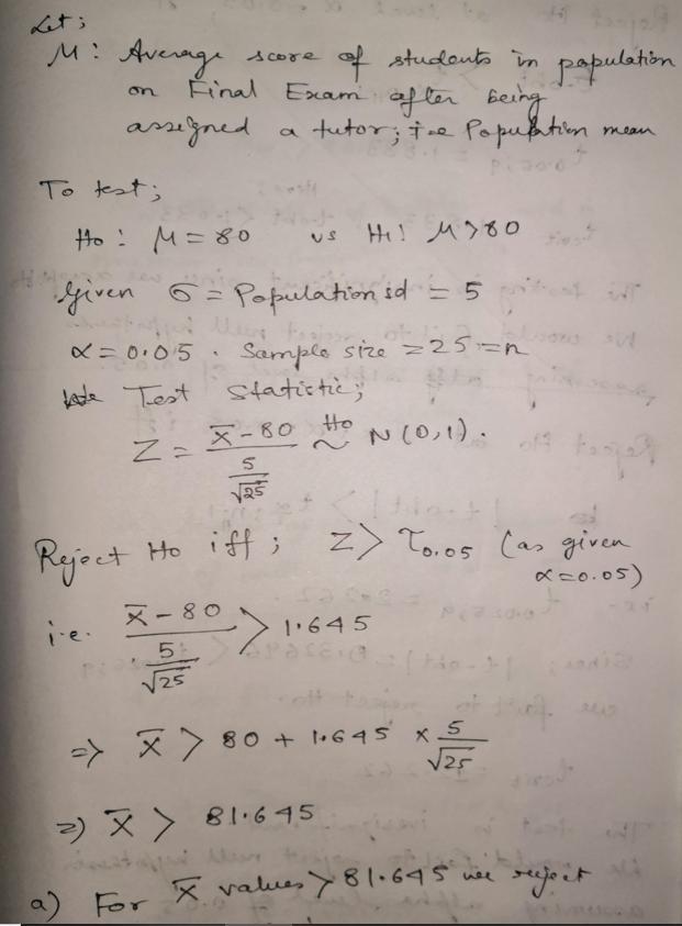 • One semester, 25 randomly chosen students are assigned a tutor who they meet with once a week. • Let X¯ be the average score on the final exam for those 25 students. • Assume that the standard deviation of final exam scores is completely unaffected by the tutoring, but that the tutoring could potentially increase exam scores (one sided test). Your null hypothesis is that tutoring has zero effect on final exam grades, and you are using a significance level of .05. (a) Under what values of X¯ would you reject the null hypothesis? (b) Suppose the null hypothesis is true. What is the probability of rejecting the null hypothesis? (c) Suppose, the null is false, and tutoring raises scores by 3 points for all students who receive it. What is the probability that X¯ will be far enough away from 80 for you to reject the null hypothesis? (d) What if tutoring raises scores by 1 point. What is the probability that X¯ will be far enough away from 80 for you to reject the null hypothesis? (e) How large would your sample have to be to have a 90% chance of rejecting the null hypothesis (assuming still that tutoring raises scores by 1 point).