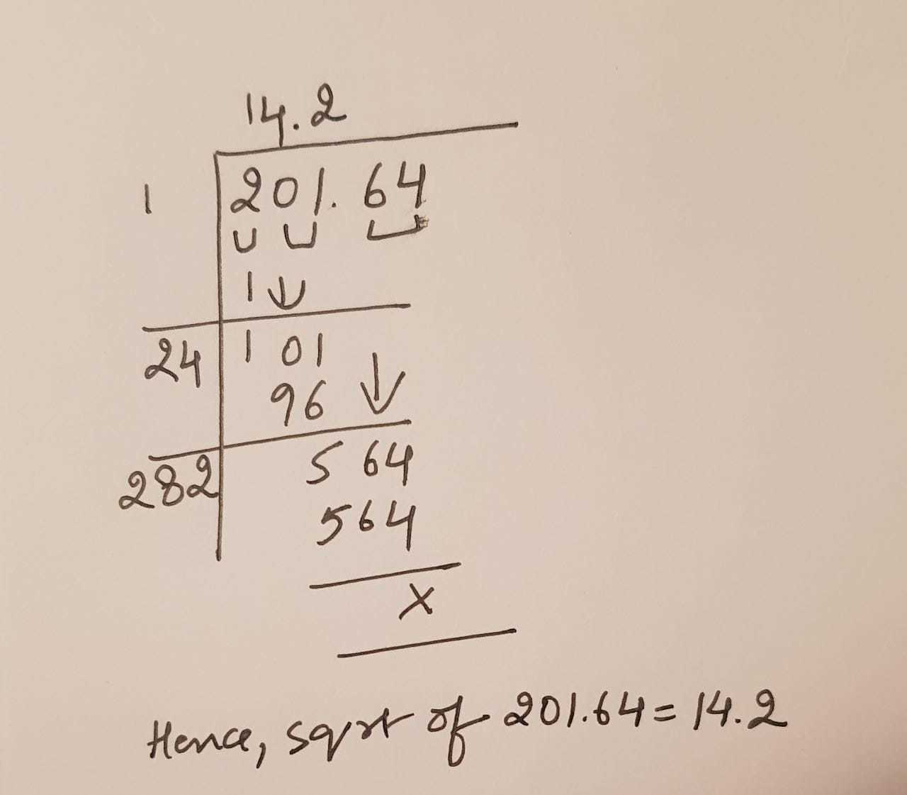 Now, double the number that is there in the quotient (so 14 becomes 28) and use it to determine the new divisor for 564. The new divisor will be such that when the divisor is multiplied with its unit digit then the product is just less than or equal to 564 (i.e. 28x * x <= 564). So for x = 2, 282 *2 = 564. Now append this 2 in the quotient. The quotient now become 14.2. And subtract 564 from 564 to find the remainder. The remainder now is 0. Hence, we have completed the problem, and we have the square root with us