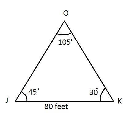 ∠J + ∠K + ∠O = 180° ⇒ 45° + 30° + ∠O = 180° ⇒ ∠O = 180° - 75° = 105°,