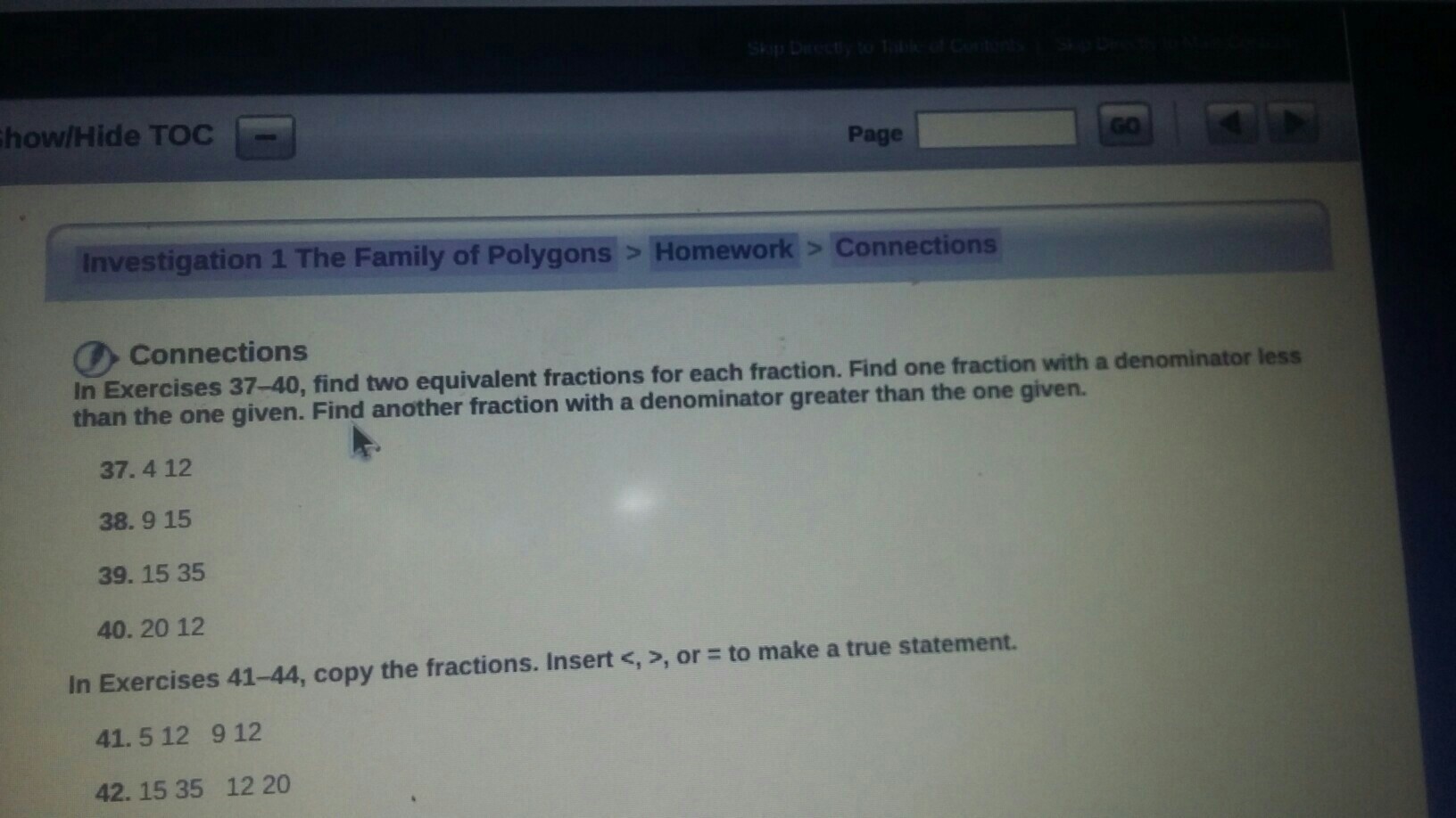 so 4/12 would be equivalent to 1/3 and 15/35 is equivalent to 3/7 ,next is 9/15 and the denominator is 15 and a less one would be 3/5 ,next is 12/20 and the denominator greater would be 18/30.