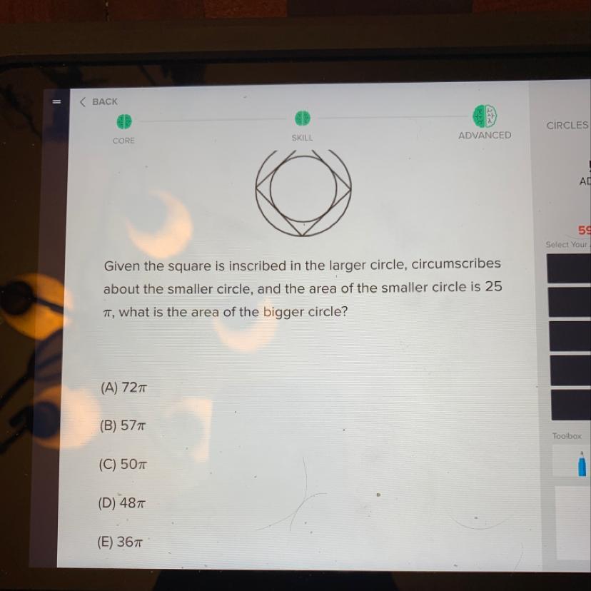 For this problem, we need to find a way to relate the inner circle, to the square, to the outer circle.